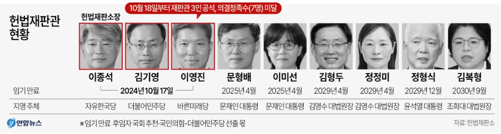 2024년 현재 헌법재판소에는 6명의 재판관만이 임명된 상태로, 국회에서 선출해야 할 3명의 재판관 자리가 공석입니다. 헌법재판소의 심판은 재판관 7명 이상 출석이 필요하므로, 이 공석이 채워지지 않으면 탄핵 심판이 진행될 수 없거나 현재 6명이 전원 찬성을 해야지만 헌법재판소에서 탄핵이 최종 승인될 수 있습니다. 현재 국회에서 선출해야할 3명의 재판관 자리가 공석입니다. 국민의힘은 조한창 변호사를, 더불어민주당은 정계선 서울서부지방법원장과 마은혁 서울서부지방법원 부장판사를 추천한 상태이며 이들은 인사청문히를 거쳐 임명될 예정입니다.